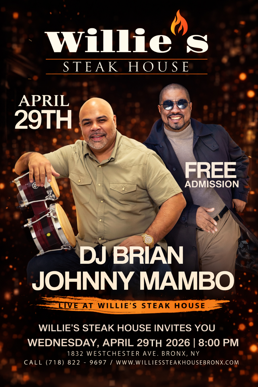 🎶 Live Music Night in the Bronx! 🎶 Join us on Wednesday, April 29th for an evening of great vibes, dancing, and Salsa music at Willie’s Steak House. 💃🕺 🎤 Live on stage: Johnny Mambo & Friends featuring Don Sonero🎧 Music by: DJ Brian Enjoy a night filled with amazing