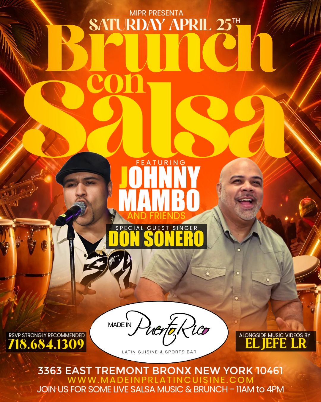 🥂💃 Brunch Con Salsa at Made In Puerto Rico 💃🥂 Get ready for the ultimate brunch party filled with live music, delicious food, and amazing energy! 🎶🔥 🎤 Live performance: Johnny Mambo & Friends featuring Don Sonero🎧 On the mix: DJ El Jefe DL LR ✨ $50 Per Person Includes:🍽️
